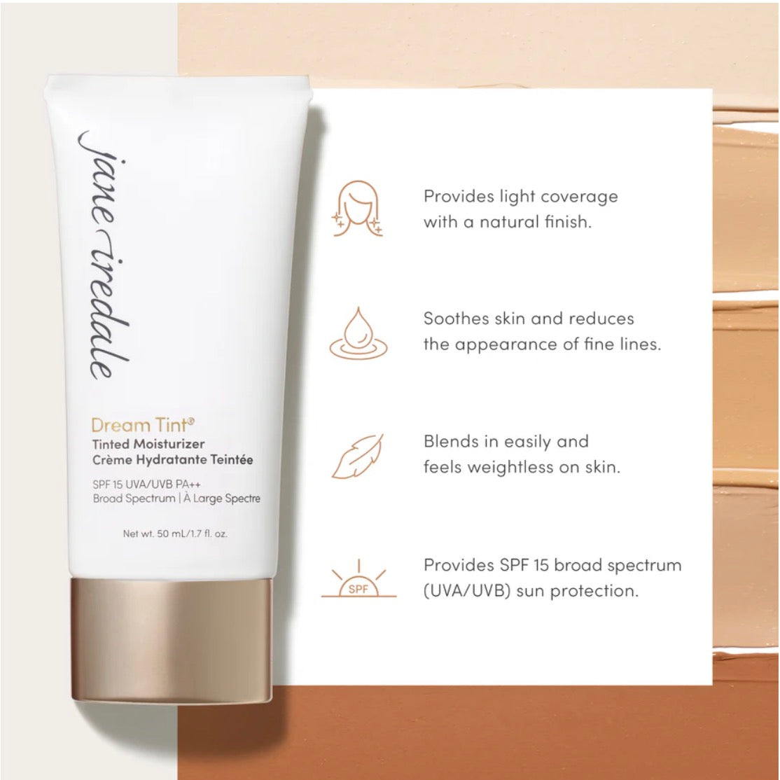 Dreamtint is een hydraterende, getinte moisturiser met een lichte, natuurlijke dekking, een hydraterende formule, een vederlicht gevoel en met SPF 15 zonbescherming.